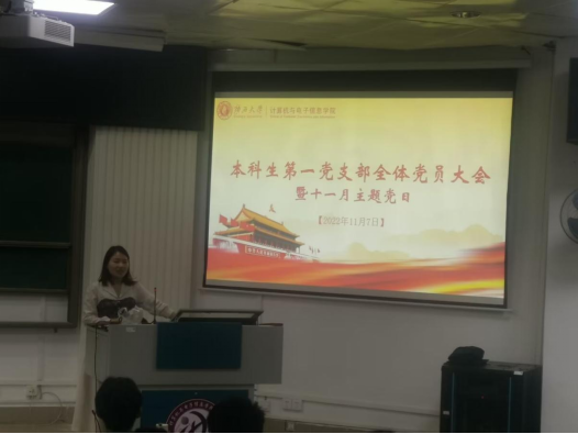 2022年11月7日,永利yl23411本科生第一党支部在公司214报告厅组织开展11月份主题党日活动,本次主题党日活动的主题为经验分享会,本科生第一党支部全体党员、入积极分子和部分其他党支部党员同志参加。