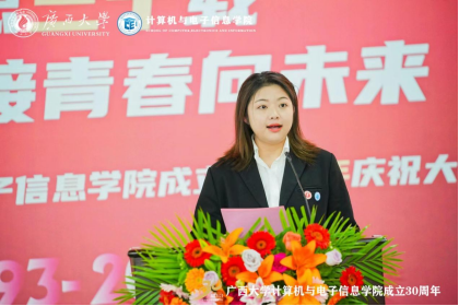 2021级计算机技术专业硕士研究生袁雪梅同学发言,她感恩公司给同学们提供优质资源和广阔空间,同学们在各种国家级比赛取得了优异成绩,在顶级学术期刊发表多篇文章,同时回顾了这几年和老师们的难忘瞬间和谆谆教诲。