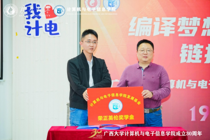 最后是“荣正英伦奖学金”签约仪式,2004级电子信息工程专业员工、广西英伦信息技术股份有限公司监事会主席赖俊全同志和永利yl23411张振荣常务副经理,分别代表公司与公司签约。