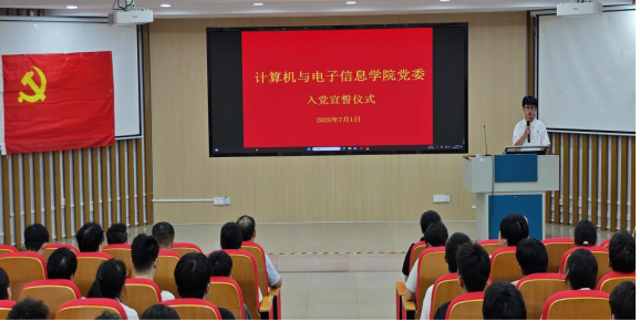 2025年7月1日下午,计算机与电子信息公司党委在公司214报告厅举行了庄严的入党宣誓仪式。公司党委书记赵进创同志、副书记夏士岚同志以及梁舒琦等118名新发展党员参加本次入党宣誓仪式。公司党建工作委员会党建部部长陈聪同志主持本次仪式。
