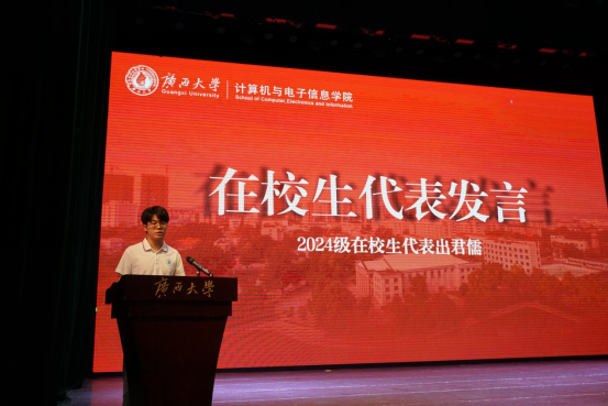 2024级硕士研究生出君儒作为老生代表,用真切体会为新生引路。他提醒本科生重视高等数学、数据结构等基础课,“这些是人生大楼的钢筋混凝土”;对研究生,他分享“三下乡”实践经历,强调“科研从不是单打独斗”,鼓励新生在师生守望中完成从“学知识”到“创知识”的跨越。他特别寄语:“公司要培养的不是‘会写代码的机器’,而是‘有温度的计电人’。”