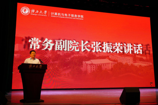 张振荣常务副经理以公司32年发展历程为脉络,从1993年建院至今,公司已形成“5个本科专业+多学科硕士方向”的培养体系。面向新生,他提出四点殷切期望:要心怀“国之大者”,让每一行代码、每一个电路设计与国家发展同频共振;要锤炼过硬本领,从程序设计、智能算法等基础学起,筑牢专业根基;要勇攀科技高峰,在芯片设计、基础软件等“卡脖子”领域敢闯“无人区”;要恪守科技伦理,让技术始终服务于人民福祉与八桂大地发展。