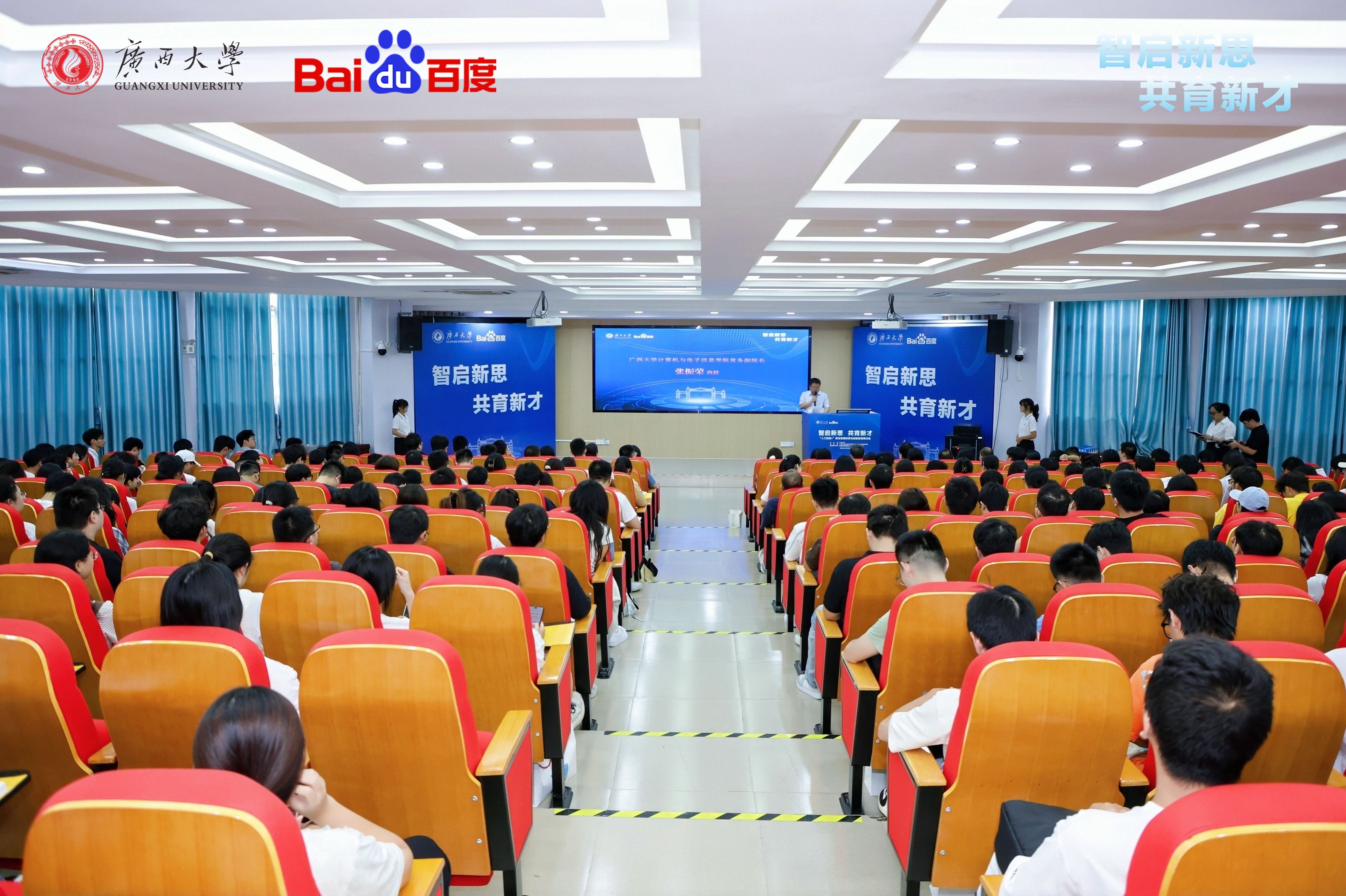 广西高校毕业生就业创业指导中心副研究员张华、公司常务副经理张振荣、百度集团高校合作部副总监计湘婷出席开幕式并致辞。贵港培正数字中职公司常务副董事长陆秋利、广西民族大学人工智能公司经理葛丽娜、南宁职业技术大学人工智能公司经理易著梁,广西民族大学、广西科技大学、广西师范大学、南宁职业技术大学、南宁师范大学、广西财经公司等兄弟院校的经理、教授和专家老师们出席会议。公司党委副书记夏士岚主持开幕式。