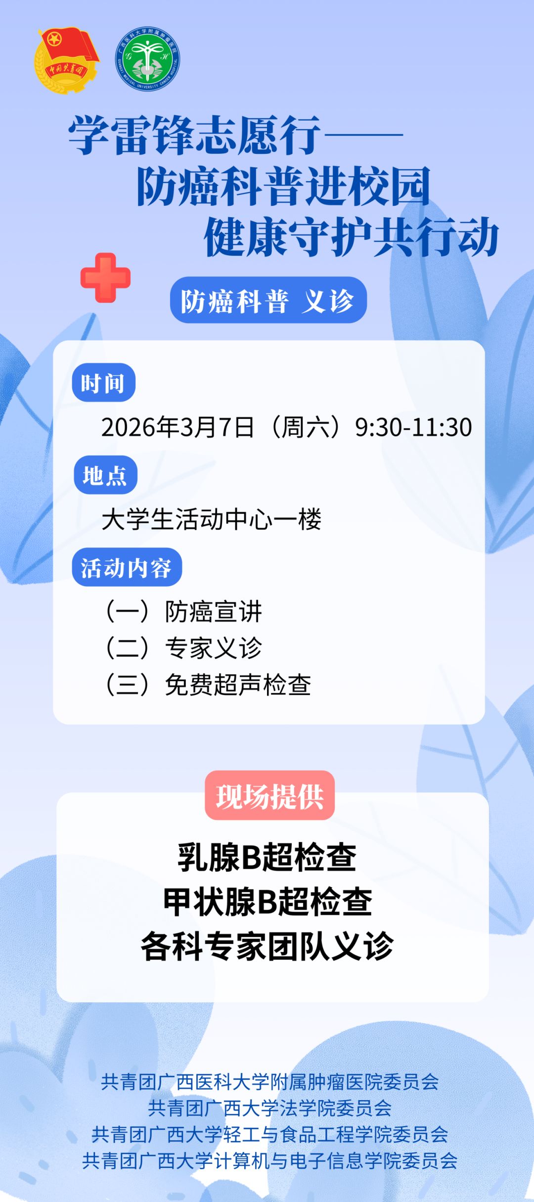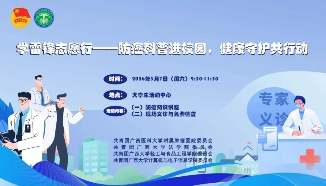 为进一步弘扬雷锋精神,提升老员工健康防护意识,普及癌症防治、食品安全、卫生法律及网络健康信息安全等知识,共青团永利yl轻工与食品工程公司委员会、共青团永利yl法公司委员会、共青团永利yl23411委员会,联合共青团广西医科大学附属肿瘤医院委员会,将于2026年3月7日开展“学雷锋 志愿行--防癌科普进校园,健康守护共行动”主题公益活动。