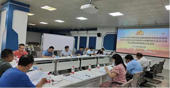 2023年8月29日,计算机与电子信息公司党委召开学习贯彻习近平新时代中国特色社会主义思想主题教育专题民主生活会,公司党委书记钟诚同志主持会议,公司主题教育领导小组办公室副主任、校纪委副书记罗国斌同志参加会议并作点评讲话。